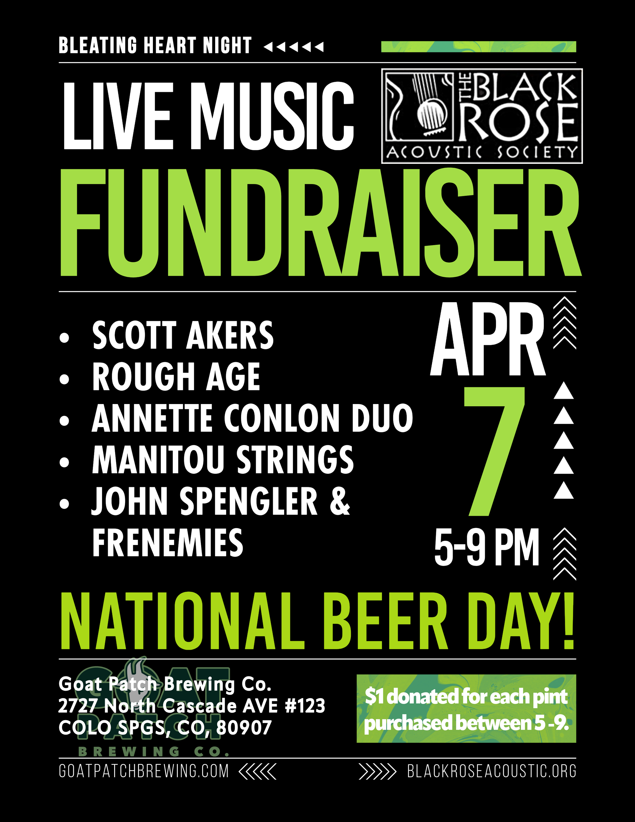 Join us on National Beer Day, Tuesday evening, April 7th, from 5 to 9 pm for Bleating Heart Night at Goat Patch Brewing. We'll be there for an evening of fine craft brews, music, and fundraising. $1 from every pint served from 5-9 will go to support the Rose. Some of our musician members will be performing, and we'll have TBRAS merchandise available for sale. Guaranteed fun! 2727 N. Cascade Ave.