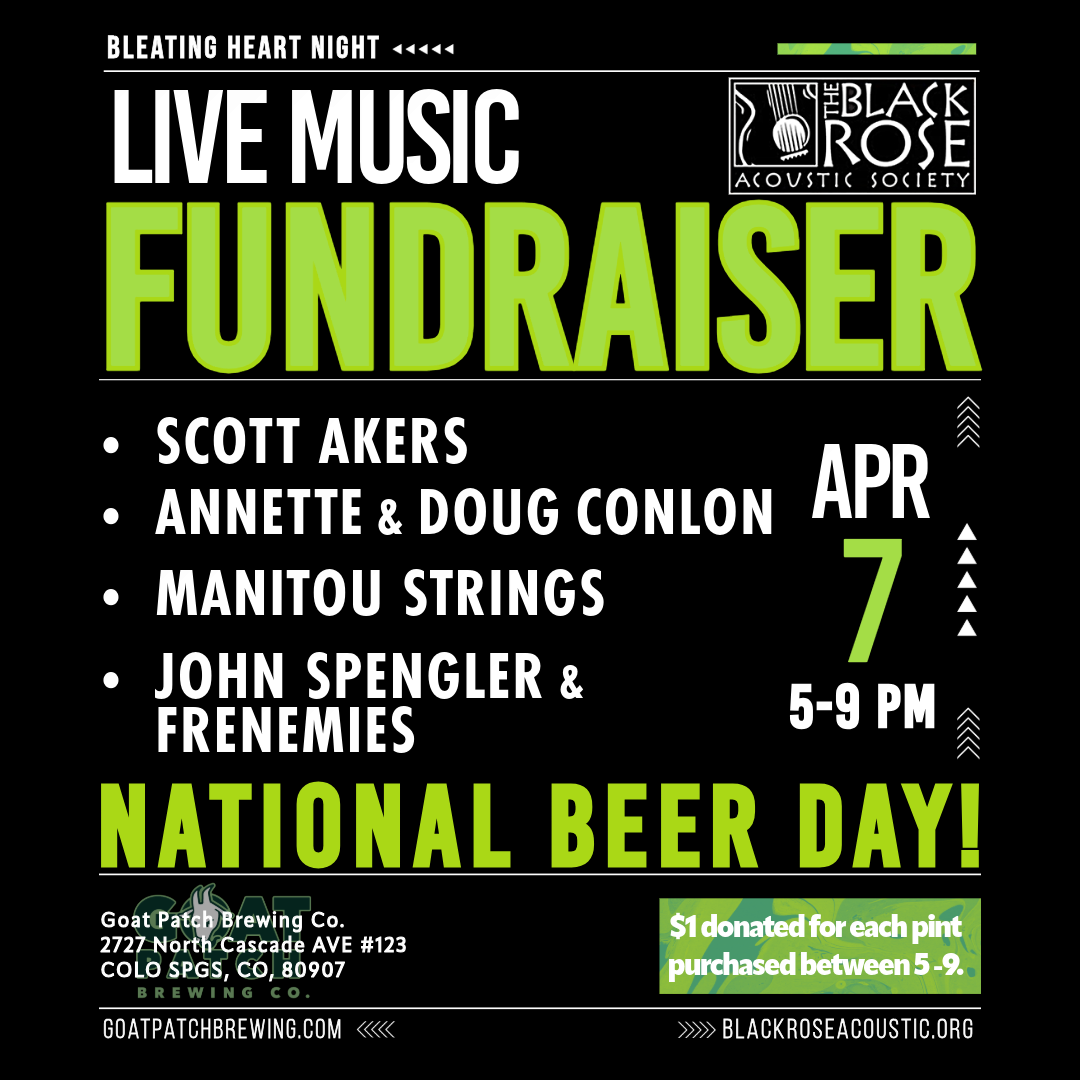 Join us on National Beer Day, Tuesday evening, April 7th, from 5 to 9pm for Bleating Heart Night at Goat Patch Brewing. We'll be there for an evening of fine craft brews, music, and fundraising. $1 from every pint served from 5-9 will go to support the Rose. Some of our musician members will be performing, and we'll have TBRAS merchandise available for sale. Guaranteed fun! 2727 N. Cascade Ave.