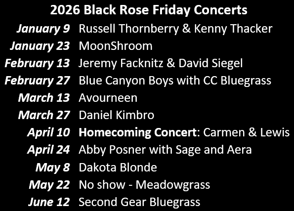 Our April Homecoming Concert is now an annual event where we feature acts with a Black Rose history to perform in our anniversary month. We encourage past members to “come home” for the concert. If you would like to be on an email reminder list and get updates on the Homecoming Concert far enough in advance to make travel arrangements, click here.